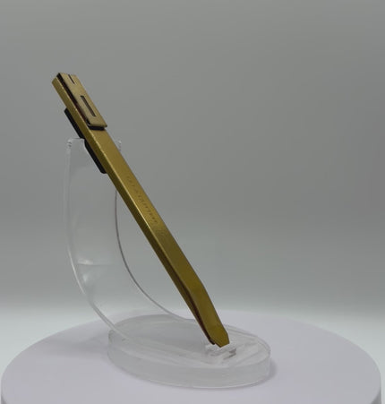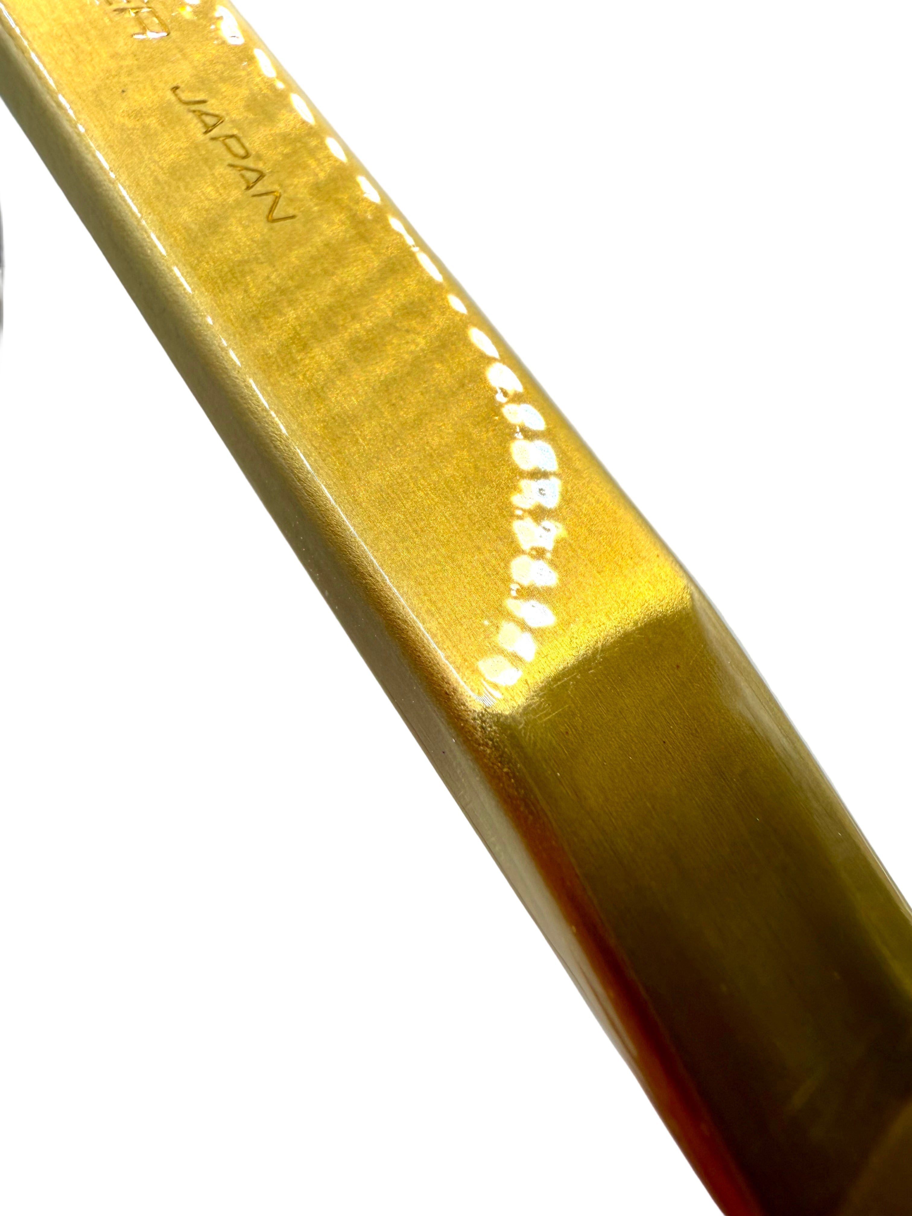 Meet Gold Member, a finish that’s as smooth, rich, and eye-catching as its name suggests. This blade is coated in a warm, metallic gold tone that glows like polished treasure. Under direct light, subtle highlights shimmer across the surface, revealing depth, warmth, and a soft, brushed-metal character that feels both refined and powerful.